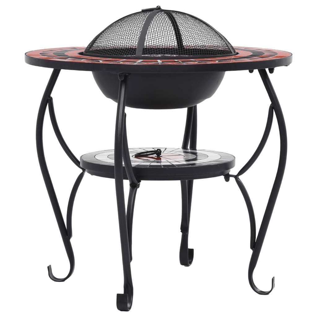 Made of steel; the fire pit bowl is excellent in absorbing and radiating heat. It can be used to burn dry wood; logs or charcoal. The fire pit is supported by a four-leg stand. The included safety mesh allows you to watch the burning fire; and encloses the fire for safety as well as preventing sparks and debris flying out. The poker tool can be used for both removing the mesh cover and rearranging the logs or coal. Additionally; the fire pit table can also be used as a barbecue. Its round ceramic surface offers a perfect place for drinks and roasting supplies.Color: Terracotta and whiteMaterial: Steel and ceramicOverall dimensions: 26.8" x 26.8" x 23.6" (L x W x H)With a four-leg standDelivery includes:1 x tabletop1 x pot1 x electroplating grid1 x black fire insulation grid1 x hook1 x mesh cover1 x mosaic round cover